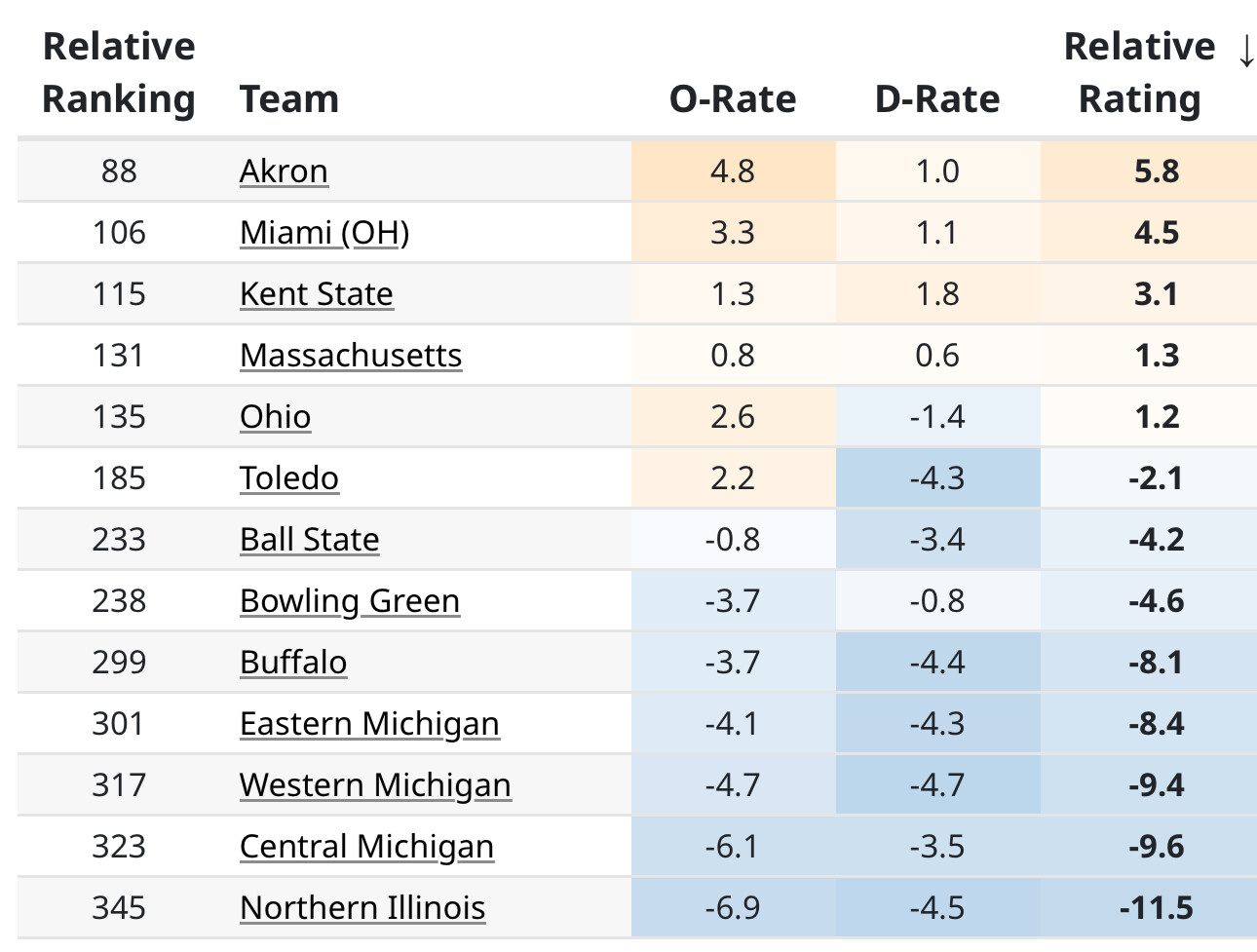 Akron is clear No. 1 … Miami is clear No. 2 but by these rankings no threat to No. 1 … Kent is clear No. 3 … but no threat to Miami or Akron.