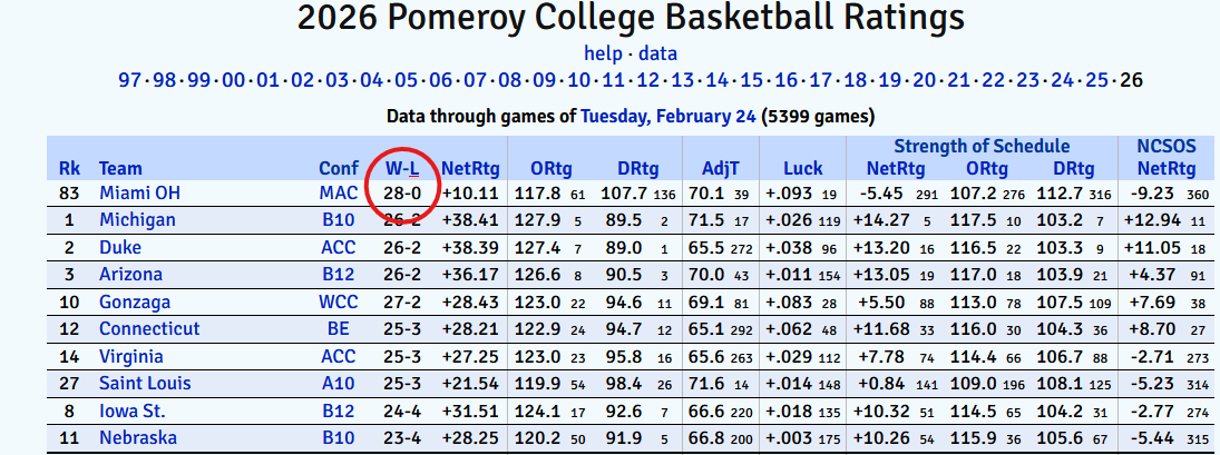 As a Kenpom subscriber, I like that a user can easily sort data. Miami is currently first in the most two important categories in any of these predictive metric sites: