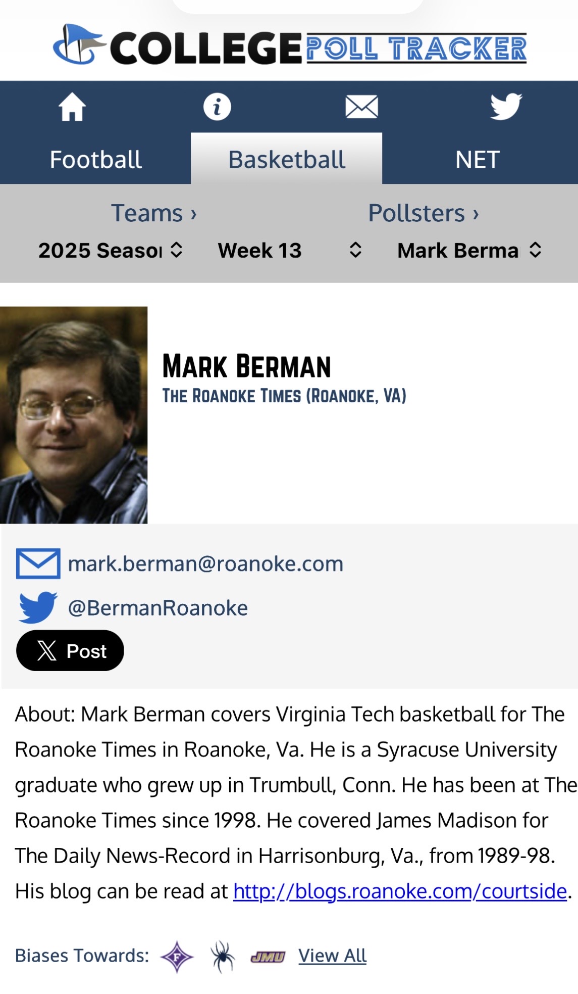 Also, Mark Berman of the Roanoke Times has us #12. This man knows ball!