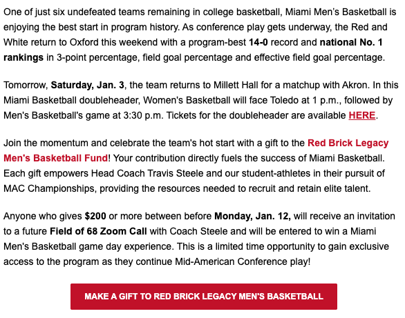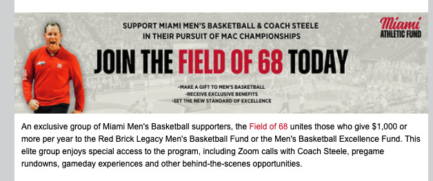 Anyone who gives $200 or more between before Monday, Jan. 12, will receive an invitation to a future Field of 68 Zoom Call with Coach Steele and will be entered to win a Miami Men’s Basketball game day experience. This is a limited time opportunity to gain exclusive access to the program as they continue Mid-American Conference play!