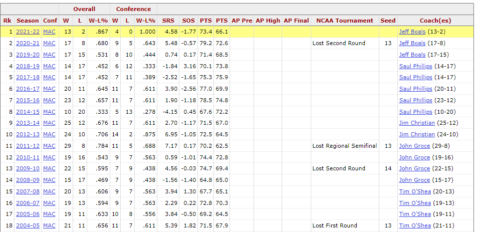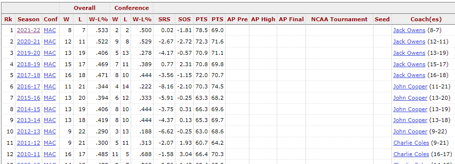 As for “getting excited about .500 basketball,” nobody is saying to get excited about it. What is being said is building a program that has, “been the worst in the MAC in the last decade,” isn’t a one season job. It’s getting players in. It’s hitting .500 for the first time in a decade. It’s then continuing to build on it. Teams that have one breakout season after years of trash go right back to trash. It didn’t build consistency. It doesn’t build culture. It’s beating one team you shouldn’t. Then doing it twice next season. Then having confidence that any game can be a win.