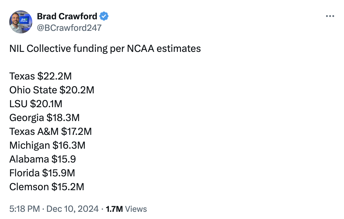 Tp put NIL in perspective, Texas, OSU and LSU are all above $20 million in collective funding in 2024.