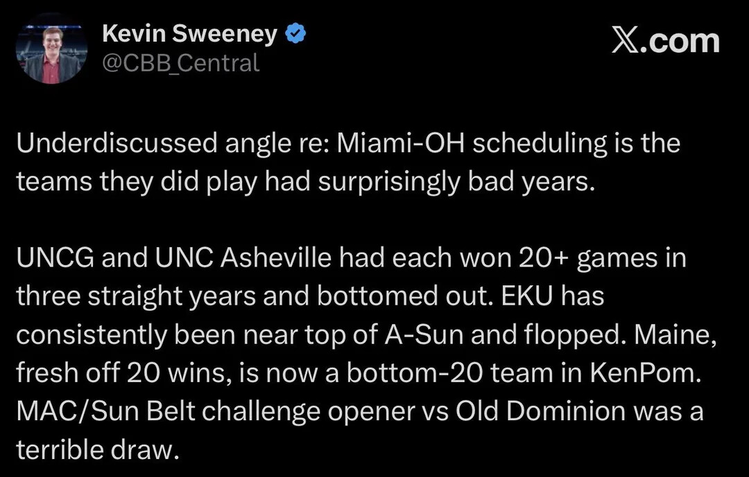 =>Lost in all this is Miami still beat one conference champion (Wright St.) and one conference runner-up (Marshall) on the road in the non-conference schedule.