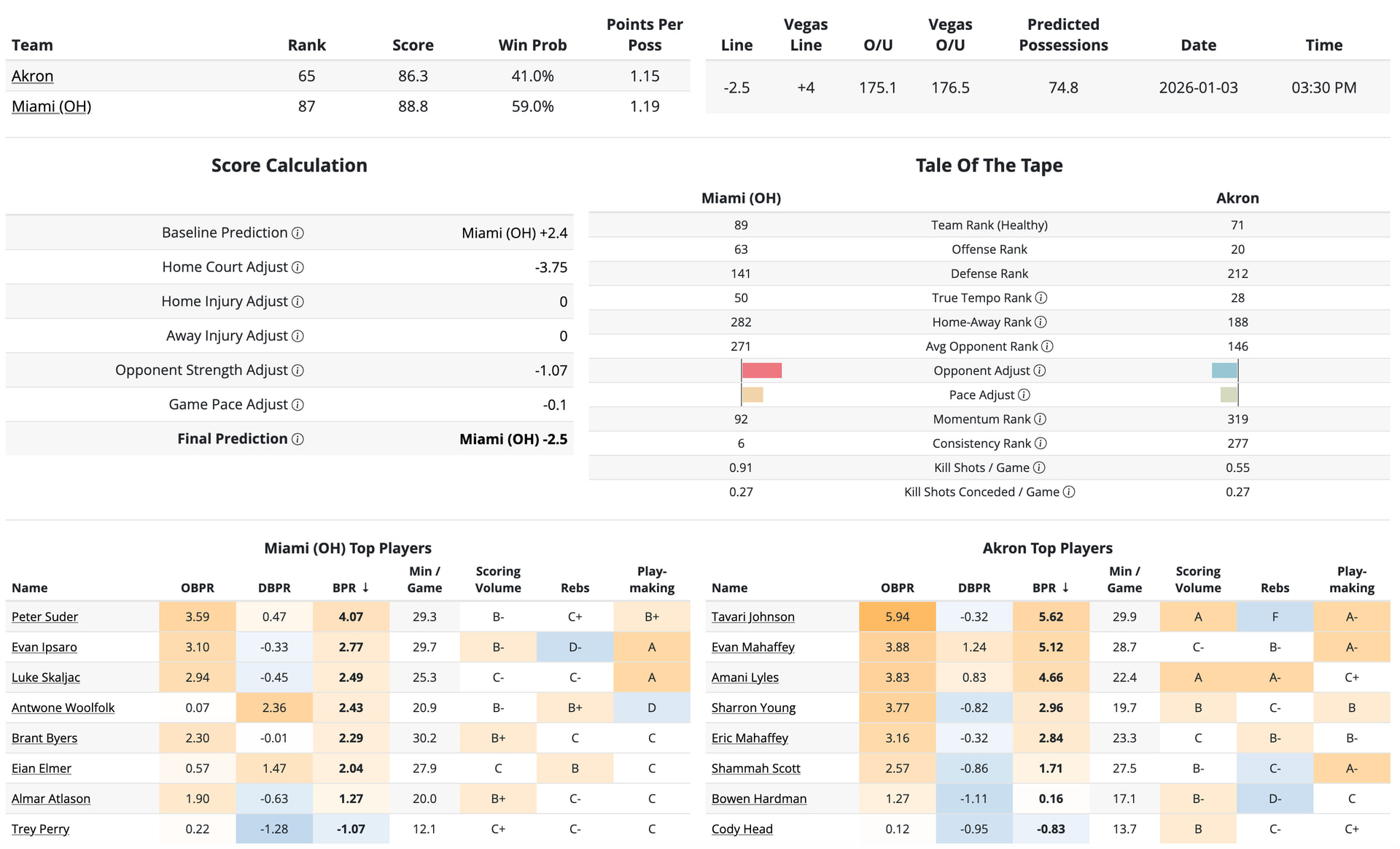 two-game winning streak. Akron went 28-7 (17-1 MAC) last year. Head coach John Groce is in his ninth season with the Zips. Heading into the 2025-26 season, Akron was selected to finish first overall in the 2025-26 MAC Preseason Men’s Basketball Poll. Senior guard Tavari Johnson was selected to the Preseason First Team AllMAC, while senior wing Evan Mahaffey and graduate student guard Shammah Scott were both named Second Team All-MAC. Johnson leads the Zips in points (20.5/game) and assists (5.1/game). Senior forward Amani Lyles has totaled the most rebounds (6.5/game). Mahaffey (1.7/game) and Johnson (1.4/game) lead the team in steals, while redshirt junior Chabi Barre (hasn’t played since 12/13 versus Murray State), Lyles (0.7/game) and Mahaffey (0.7/game) have produced the most blocks.