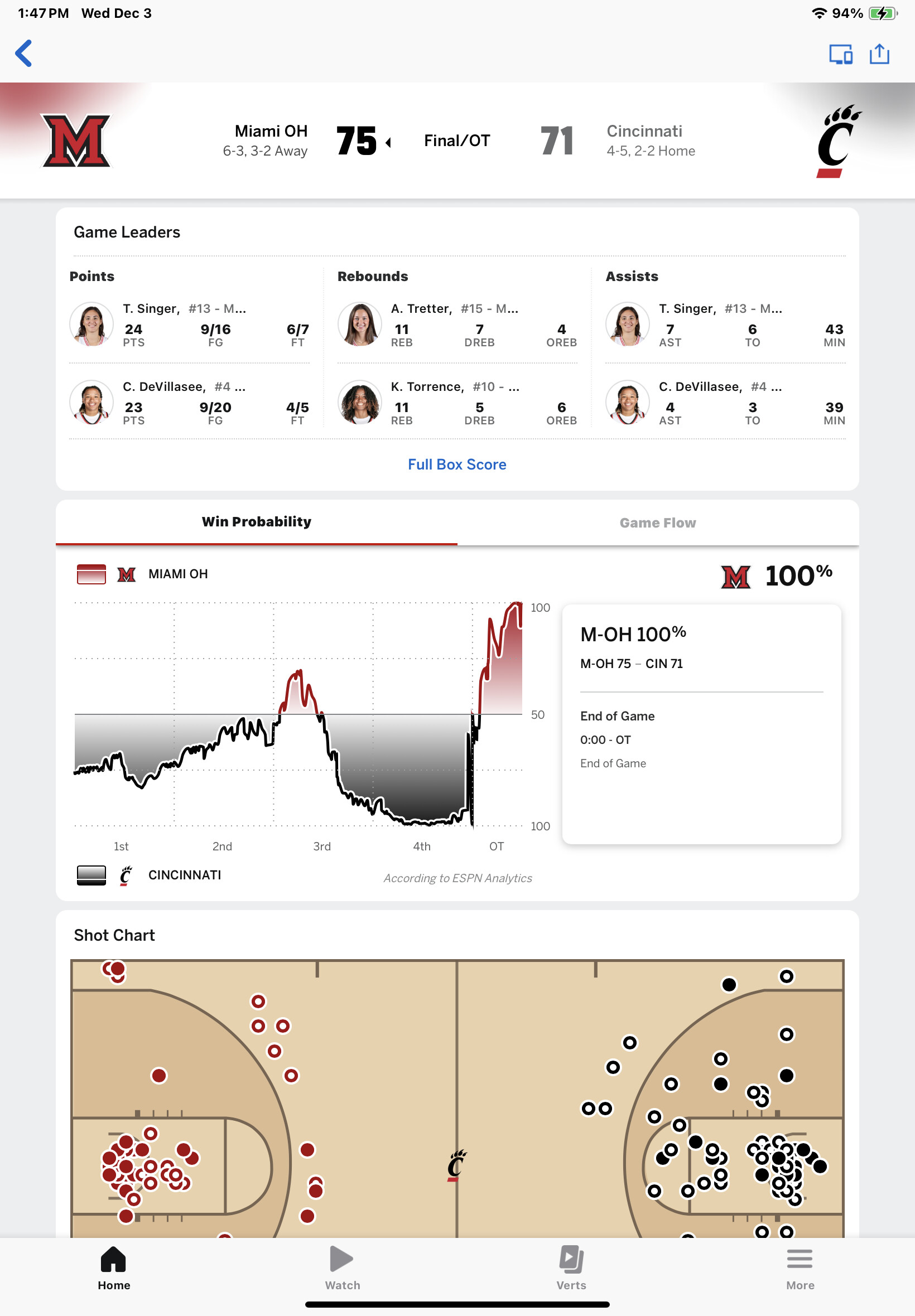 9-8 UC after one quarter. Miami playing good defense but UC’s length and quickness is causing Miami fits on offense. Getting looks but clearly length affecting it. Blumenfeld doesn’t even appear to be on the bench so we only have11 players and not much height. Spending a lot of energy on D.