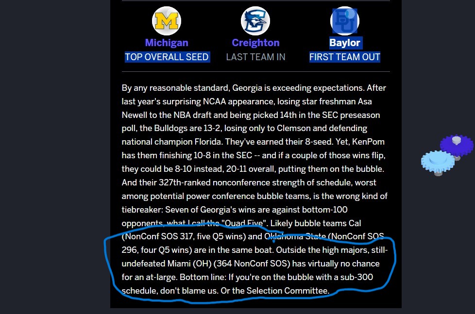Almost every game for big conferences now is a quality opponent so theyāll start jumping the mid major and small schools who creeped into the top 50-60 as small schools have basically no quality games to add. NET is built to like a .500 SEC team more than a 17-1 MAC team.
