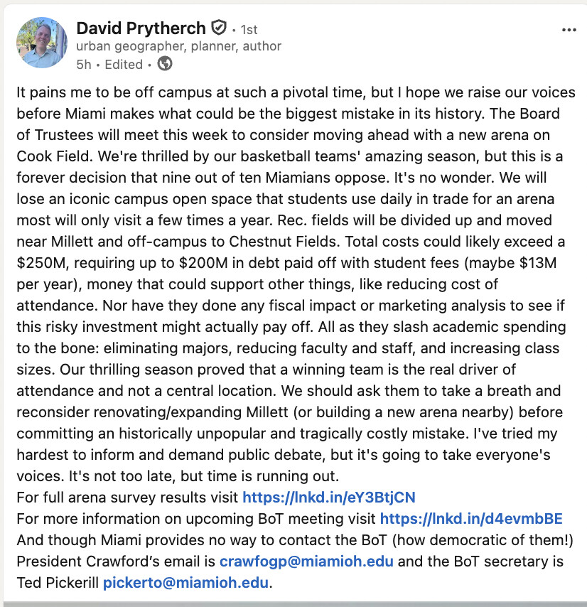 Most people don’t realize there used to be a golf course on campus, a parking garage is where old Goggin is, Pearson is where Miami Field was, Withrow is a dorm. Point being there is always going to be something where something else was or is. Most people (not all) that don’t want an arena on Cook Field don’t want a new arena anywhere. They don’t want Miami investing in athletics, they want 100% going to academics.