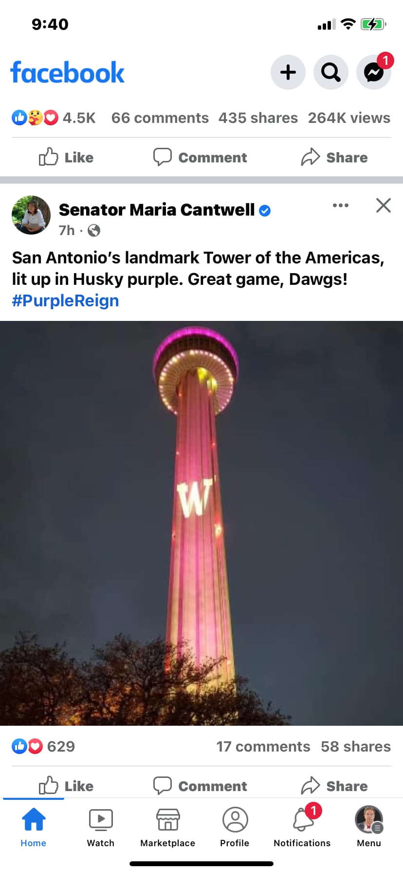 Another Miami alum cheers for the Washington Huskies. Maria was active in the Miami Alumni Chapter I founded in Seattle in 1976. We sat together at the luncheon we held at Salty’s for Randy Walker. Oddly, Maria was my rep in the Washington Legislature, my Congresswoman and ultimately my US Senator. I visited her a couple of times at her DC offices on my business trips back east.