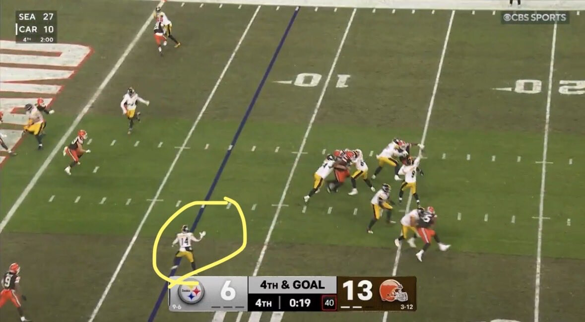 Gainwell had chipped the DE and then started his little drag route. The still photo makes it look like he was open, but no way Rodgers was going to hold the ball that long just to throw it 6 yards short of the end zone. Even if he does, it is maybe 50/50 Gainwell scores.