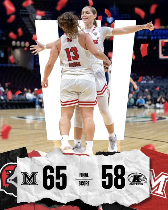 57-46 Miami under 5 timeout. Tretter, Devries and Jurjo each wtih 4 fouls. This is Singer’s game. Masterful both ends. Singer has 23 points, 6 assists, 5 rebounds and her usual hounding D. Showing why she was slighted on the All MAC teams. Singer is the best PG in the MAC and it isn’t even close. Miami needs to finish strong and hope our players with 4 fouls don’t foul out.