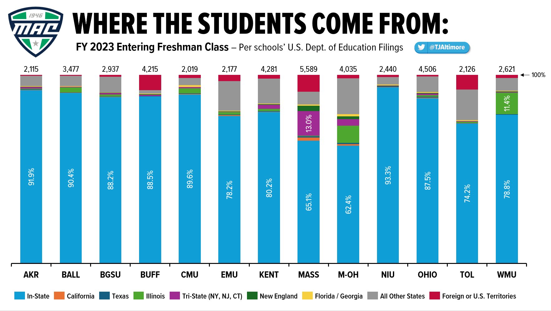 Interesting chart. It would seem like Miami has been successfully broadening our regional and national recruiting. I believe that it wasn’t too long ago that over 75% of out of state students were coming from the Chicago pipeline.