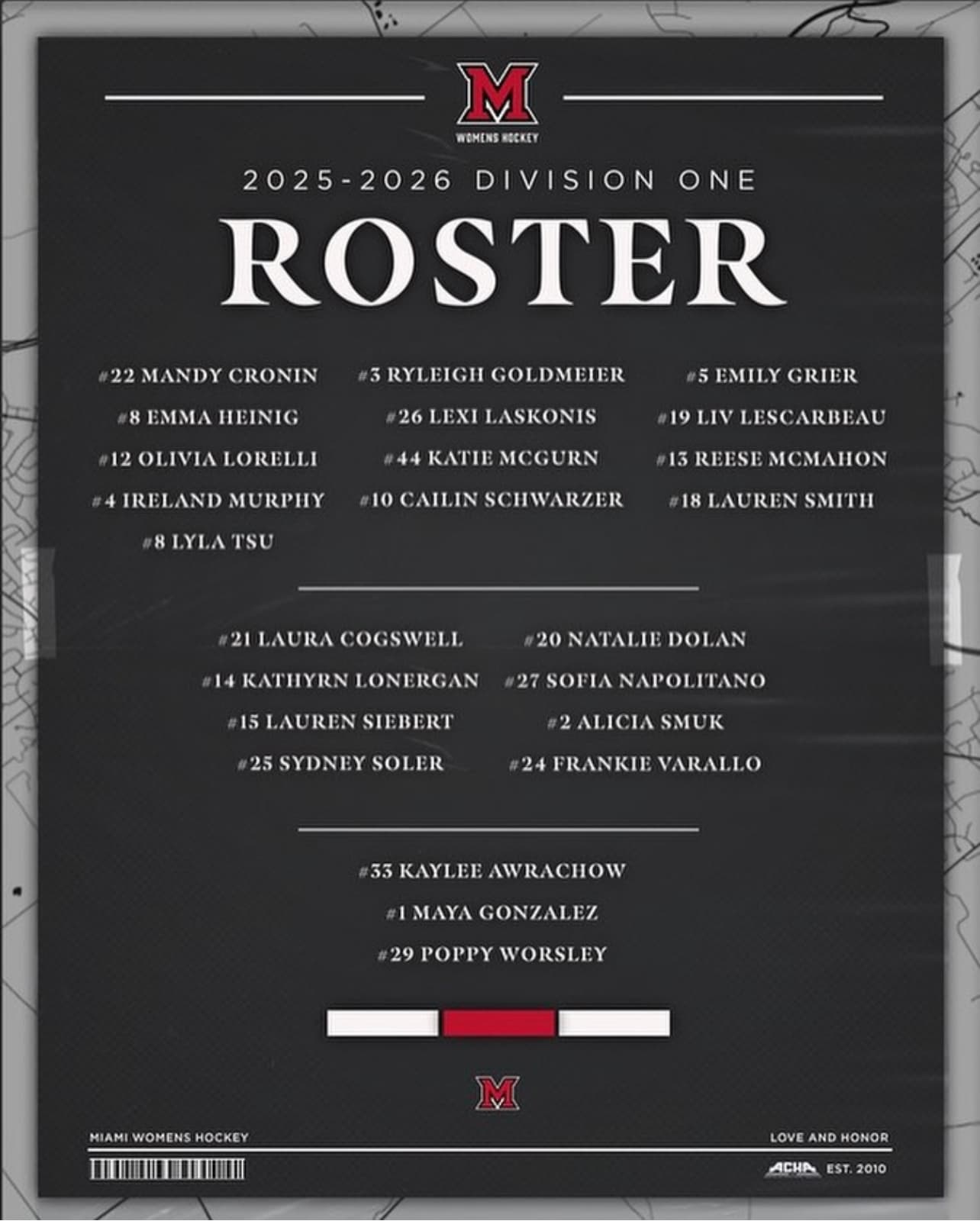 Miami sweeps the opening series of the year by winning today 4-1. First years Liv Lorelli and Ireland Murphy scored their first collegiate goals and Lauren Smith potted two more for a total of three on the weekend. Goalie Maya Gonzalez just missed her second consecutive shut-out when GVSU’s Peyton Wysocki scored mid-way through the third.